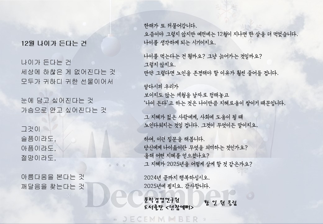 2024년 12월 시마음 페이지 정보 작성자 문학경영연구원 댓글 댓글 0건 조회Hit 2,369회 작성일Date 24-12-26 17:47 본문 2024년 12월 시마음 목록 이전글2025년 1월 시마음 25.01.25 다음글2024년 11월 시마음 24.12.26 댓글 0 댓글목록 등록된 댓글이 없습니다.