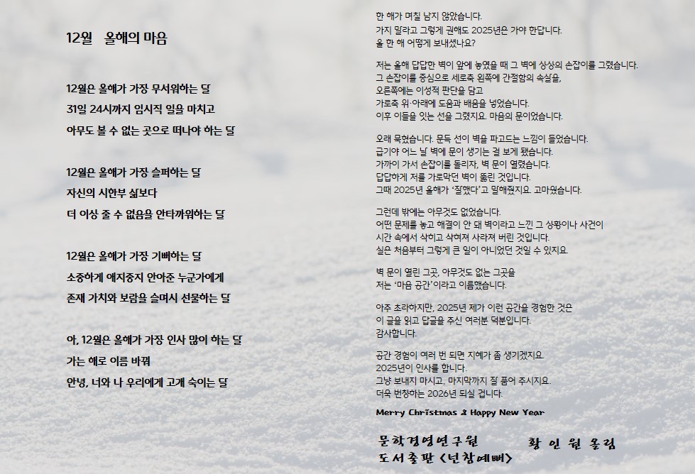 2025년 12월 시마음 페이지 정보 작성자 문학경영연구원 댓글 댓글 0건 조회Hit 312회 작성일Date 25-12-23 14:20 본문 2025년 12월 시마음 목록 이전글2026년 1월 시마음 26.01.20 다음글2025년 11월 시마음 25.11.26 댓글 0 댓글목록 등록된 댓글이 없습니다.
