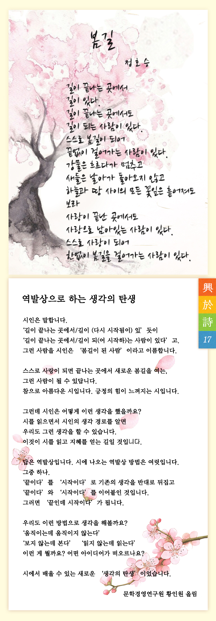 흥어시(興於詩) 배달 17 [봄길- 정호승] 페이지 정보 작성자 문학경영연구원 댓글 댓글 0건 조회Hit 5,664회 작성일Date 15-03-23 10:56 본문 흥어시(興於詩) 배달 17 [봄길- 정호승] 목록 이전글흥어시(興於詩) 배달 15 [여의나루역에서- 박순원] 15.04.22 다음글흥어시(興於詩) 배달 16 [하늘을 만지는 나무- 이기철] 15.02.24 댓글 0 댓글목록 등록된 댓글이 없습니다.