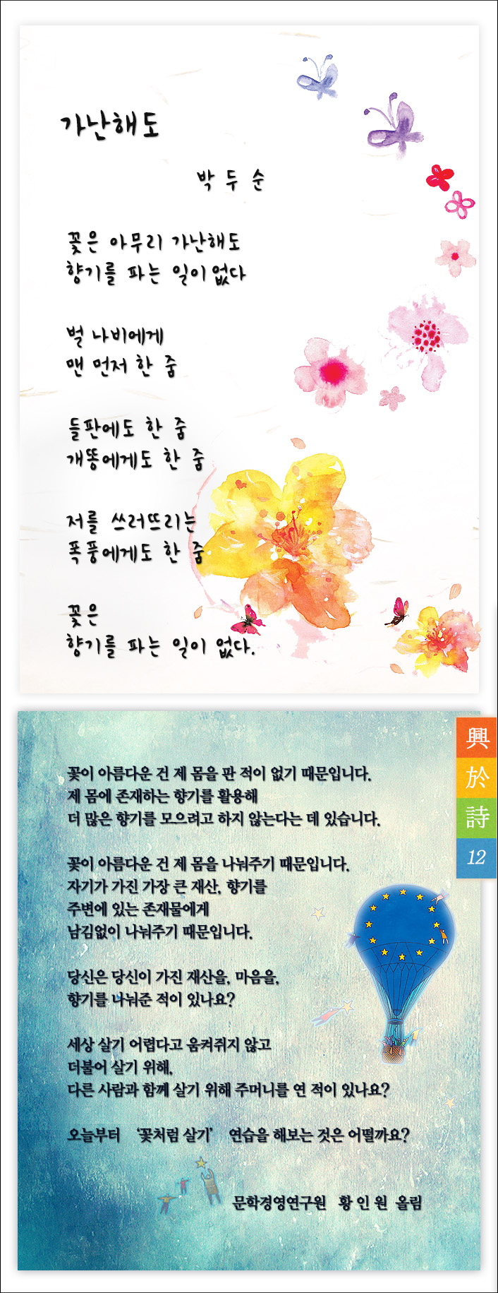 흥어시(興於詩) 배달 12 [가난해도- 박두순] 페이지 정보 작성자 문학경영연구원 댓글 댓글 0건 조회Hit 4,937회 작성일Date 14-10-20 16:06 본문 흥어시(興於詩) 배달 12 [가난해도- 박두순] 목록 이전글흥어시(興於詩) 배달 13 [낙엽- 이재무] 14.11.20 다음글흥어시(興於詩) 배달 11 [풀- 김종해] 14.09.22 댓글 0 댓글목록 등록된 댓글이 없습니다.