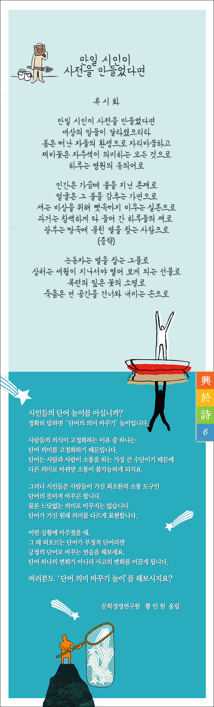 흥어시(興於詩) 배달 06 [만일 시인이 사전을 만들었다면_류시화] 페이지 정보 작성자 문학경영연구원 댓글 댓글 0건 조회Hit 6,914회 작성일Date 14-04-23 17:34 본문 만일 시인이 사전을 만들었다면_류시화2014.4. 배달 목록 이전글흥어시(興於詩) 배달 07 [구부러진 못_유미희] 14.05.21 다음글2023년 4월 시마음 23.04.21 댓글 0 댓글목록 등록된 댓글이 없습니다.