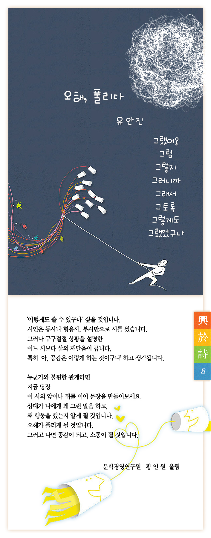 흥어시(興於詩) 배달 08 [오해,풀리다 - 유안진] 페이지 정보 작성자 문학경영연구원 댓글 댓글 0건 조회Hit 5,812회 작성일Date 14-06-11 15:55 본문 오해,풀리다_유안진 2014년 6월 배달 목록 이전글흥어시(興於詩) 배달 09 [산책- 나혜경] 14.07.18 다음글흥어시(興於詩) 배달 07 [구부러진 못_유미희] 14.05.21 댓글 0 댓글목록 등록된 댓글이 없습니다.