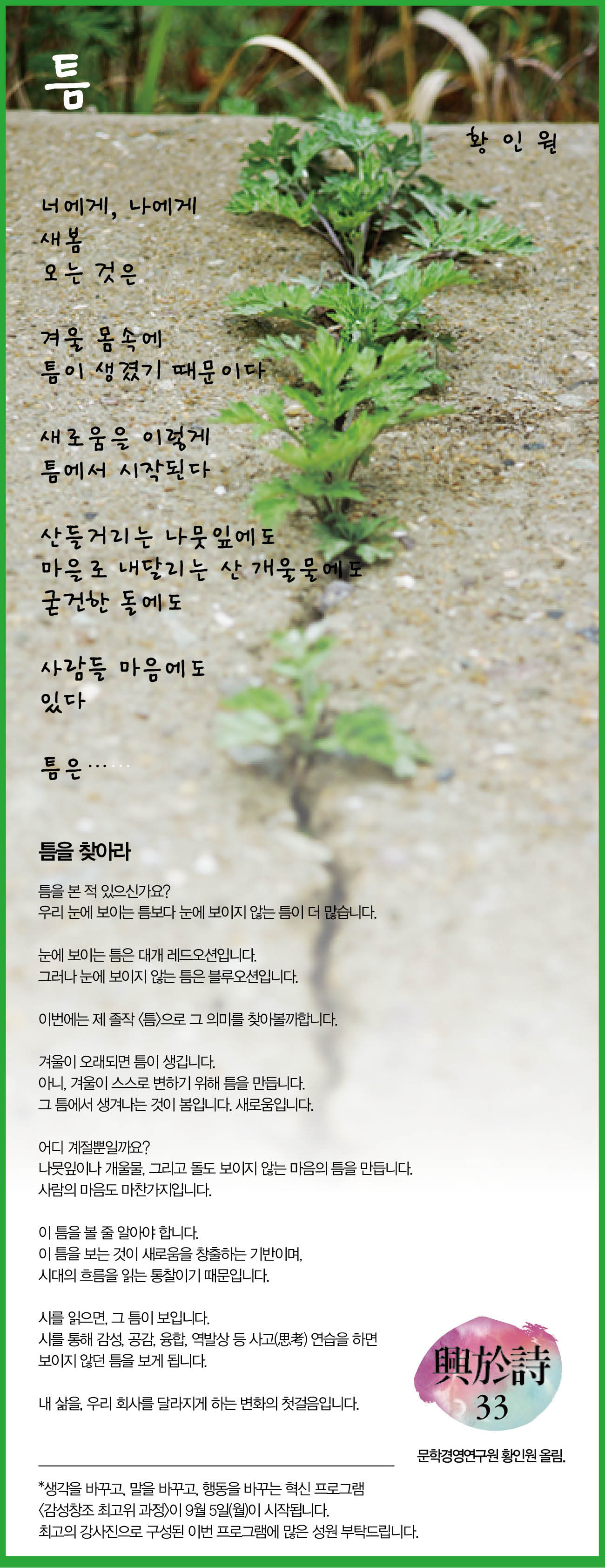 틈의 긍정성을 시를 통해 살펴보시지요.