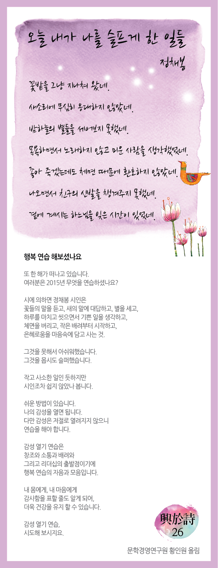 흥어시 26번째입니다 페이지 정보 작성자 문학경영연구원 댓글 댓글 0건 조회Hit 6,253회 작성일Date 15-12-22 12:33 본문 2015년 마무리 잘 하시기 바랍니다 목록 이전글27번째 흥어시입니다 16.01.25 다음글25번째 흥어시를 올립니다 15.11.20 댓글 0 댓글목록 등록된 댓글이 없습니다.