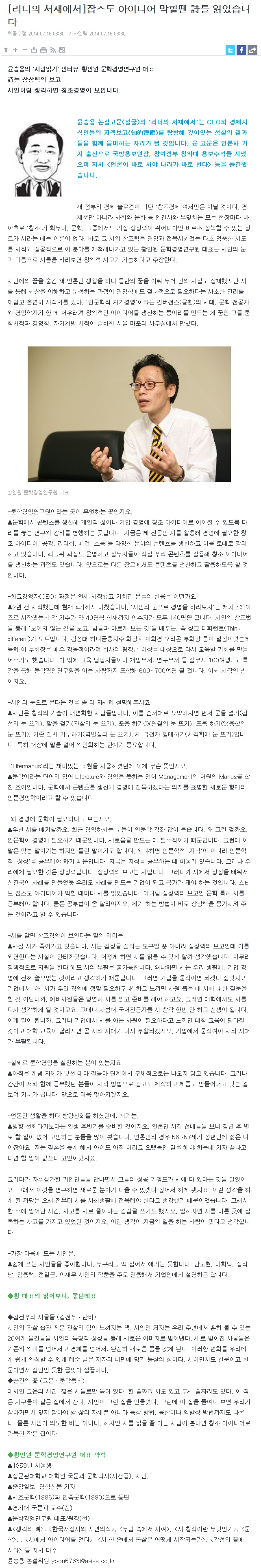 아시아경제 [리더의 서재에서]잡스도 아이디어 막힐땐 詩를 읽었습니다 페이지 정보 작성자 문학경영연구원 댓글 댓글 0건 조회Hit 9,756회 작성일Date 14-07-21 11:23 본문 . 관련링크 http://view.asiae.co.kr/news/view.htm?idxno=2014070314474335018 6437회 연결 목록 이전글TEDxHangang 5th Event "시에서 배우는 창조아이디어" 14.09.17 다음글MTN 머니투데이방송 시(詩)와 경영, 문학경영연구원 황인원 대표 2014-05-19 14.05.23 댓글 0 댓글목록 등록된 댓글이 없습니다.